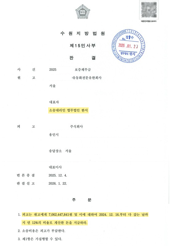 법무법인 한서는 복잡한 채권양도 구조와 보증채무 관계를 면밀히 정리하여 원고의 권리를 적극적으로 주장하였고, 그 결과 원고의 청구가 전부 인용되는 판결을 이끌어낼 수 있었습니다.